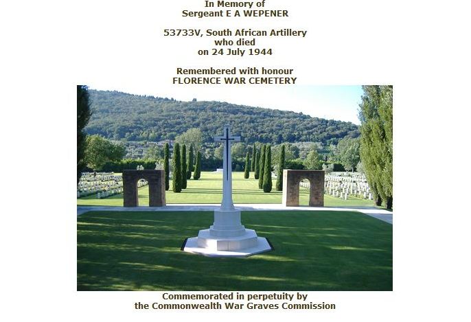 4 Commonwealth War Graves Commission database(www.cwgc.org : accessed 29 Aug 2010), Sergeant E A Wepener; http://www.cwgc.org/search/certificate.aspx?casualty=2379626.